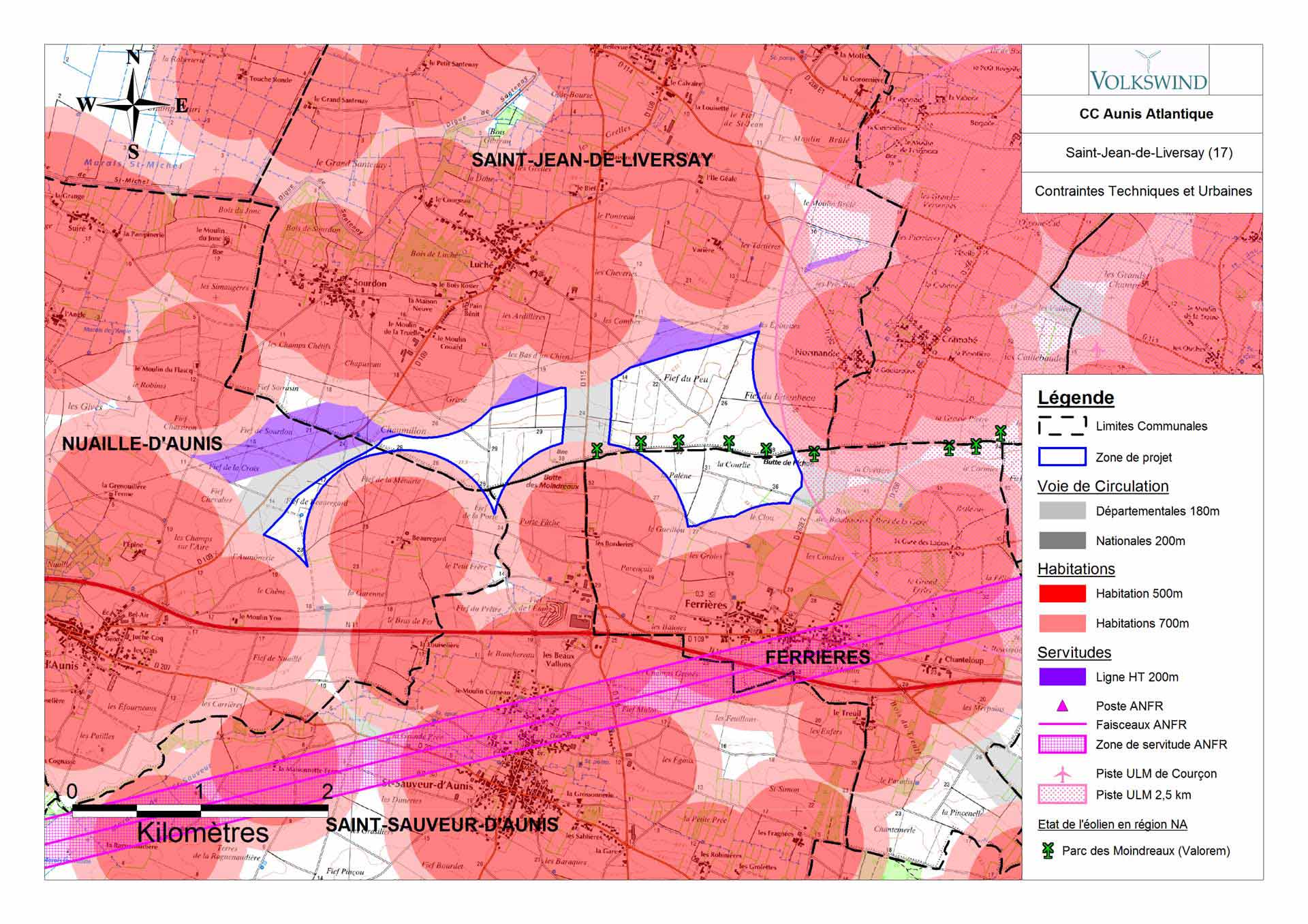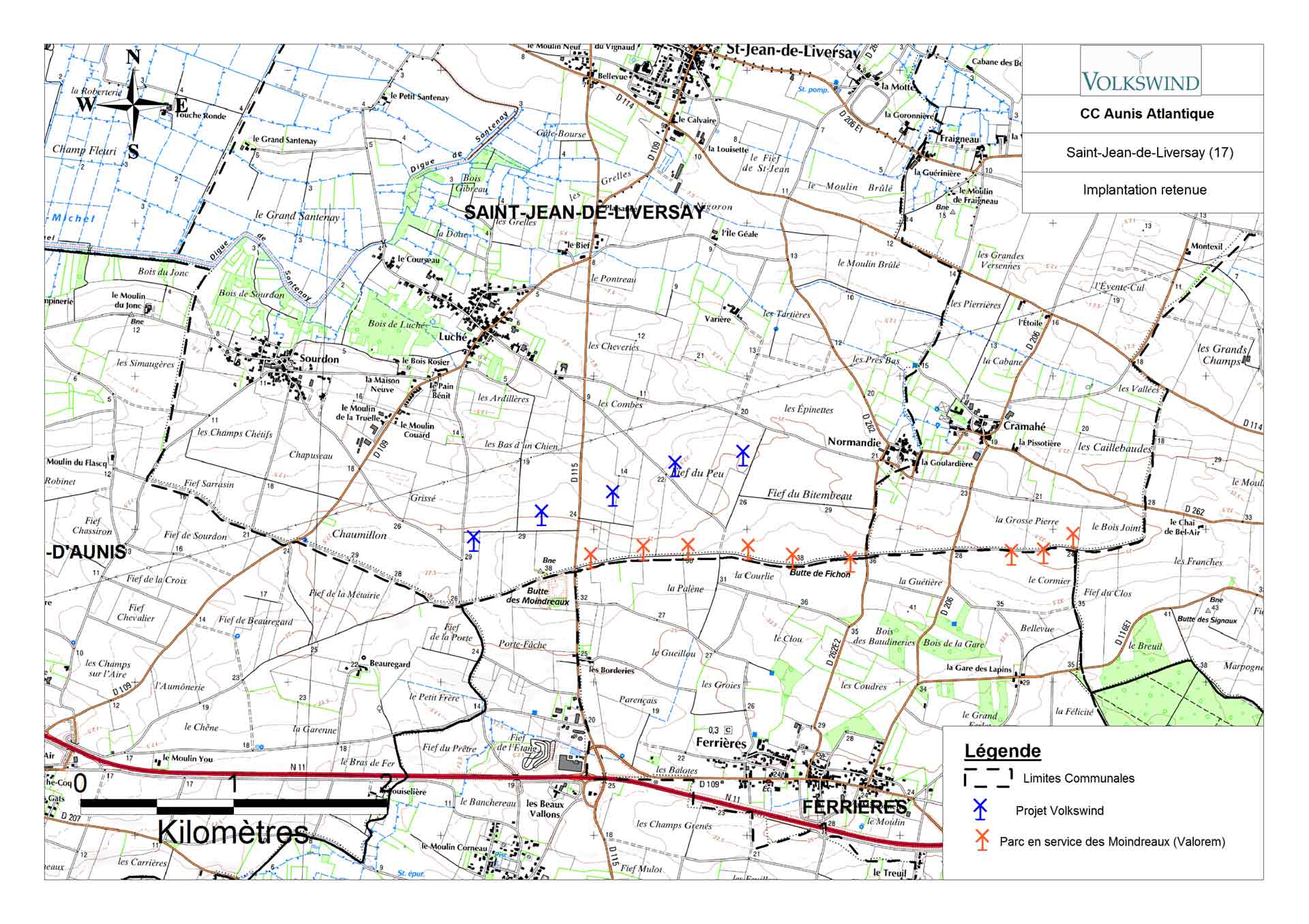 Le projet de Ferme Éolienne de Saint-Jean-de-Liversay permet la valorisation d’une zone particulièrement adaptée à l’énergie éolienne (grand éloignement des habitations, absence de zones naturelles protégées, bonne intégration paysagère, etc... ) en ajoutant une ligne de cinq éoliennes (bleues) en parallèle des éoliennes en exploitation (orange).